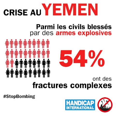 Handicap International fournit des soins de réadaptation dans un centre spécialisé et dans les services de réadaptation de deux hôpitaux de Sanaa, la capitale du Yémen. En moyenne, 250 personnes bénéficient ainsi chaque mois du soutien de l'association. Avec le conflit commencé en mars 2015, les besoins en réadaptation ont augmenté alors que les services dans ce domaine, déjà faibles auparavant dans le pays, ont fortement diminué.