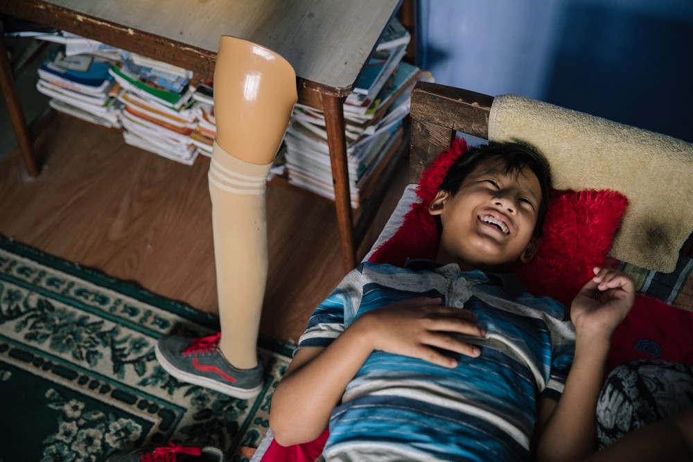 Jeune Népalais de 14 ans, Nishan a été amputé de la jambe gauche à 5 ans suite à un accident avec un camion. Grâce au soutien de Handicap International, aujourd’hui il remarche, va à l’école, joue au badminton et rêve de voyages.
