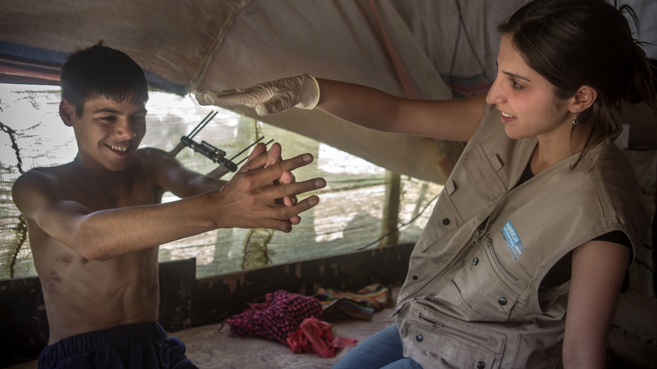Victime d'un sniper en Syrie, Dyaa, 6 ans, gravement blessé, a vu son frère mourir devant ses yeux, avant d'être évacué en Jordanie où il est soigné. Il est désormais suivi par Handicap International et retrouve peu à peu l'usage de son bras.