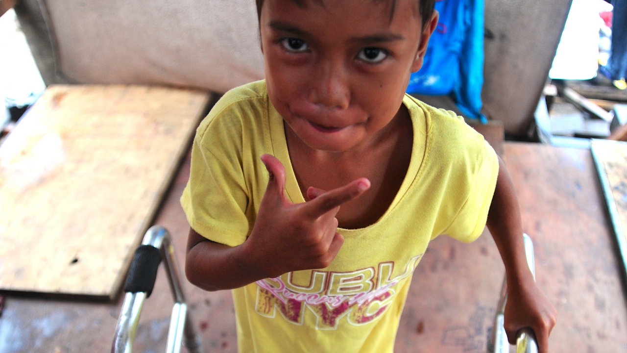 Jesus, 7 ans, n’avait jamais fait un pas. Rencontré lors de la mission d’urgence de Handicap International après le passage du typhon Haiyan, il marche aujourd’hui grâce au déambulateur fourni par l’association.