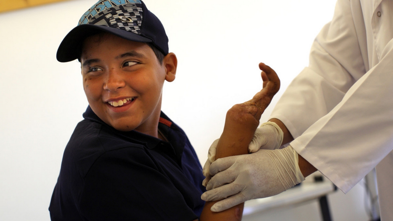 Il y a six mois lors d'un bombardement, un mur s'est effondré sur Yamen, un jeune Syrien de 3 ans. Grièvement blessé, il est depuis paralysé partiellement en dessous de la taille. Malgré son jeune âge, il fait preuve d'un courage exemplaire. Il est accompagné par les équipes de Handicap International.